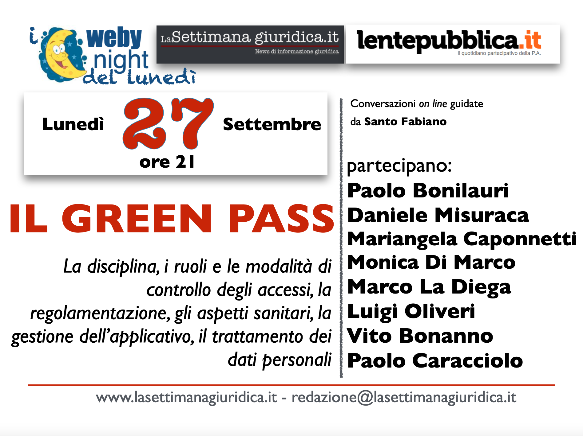 Nel prossimo “webynight” del lunedì sera (il 27 settembre, a partire dalle 21) trattiamo il tema della verifica del Green pass e dei requisiti prescritti per accedere alle pubbliche amministrazioni.