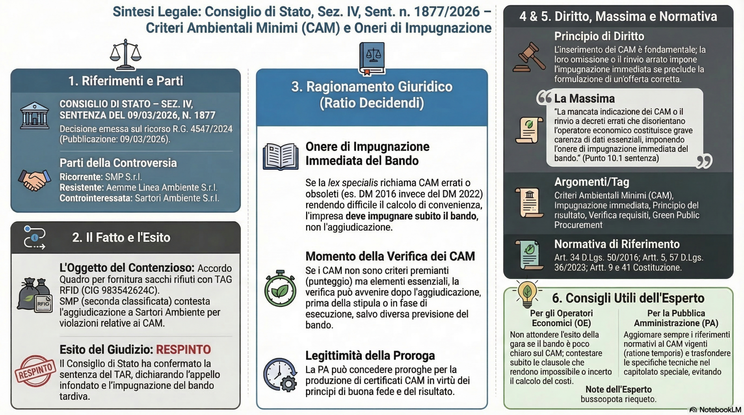 La sentenza n. 1877/2026 del Consiglio di Stato affronta il tema della corretta integrazione dei Criteri Ambientali Minimi (CAM) all’interno delle procedure di gara pubblica, con particolare riferimento al settore del Green Public Procurement (GPP).